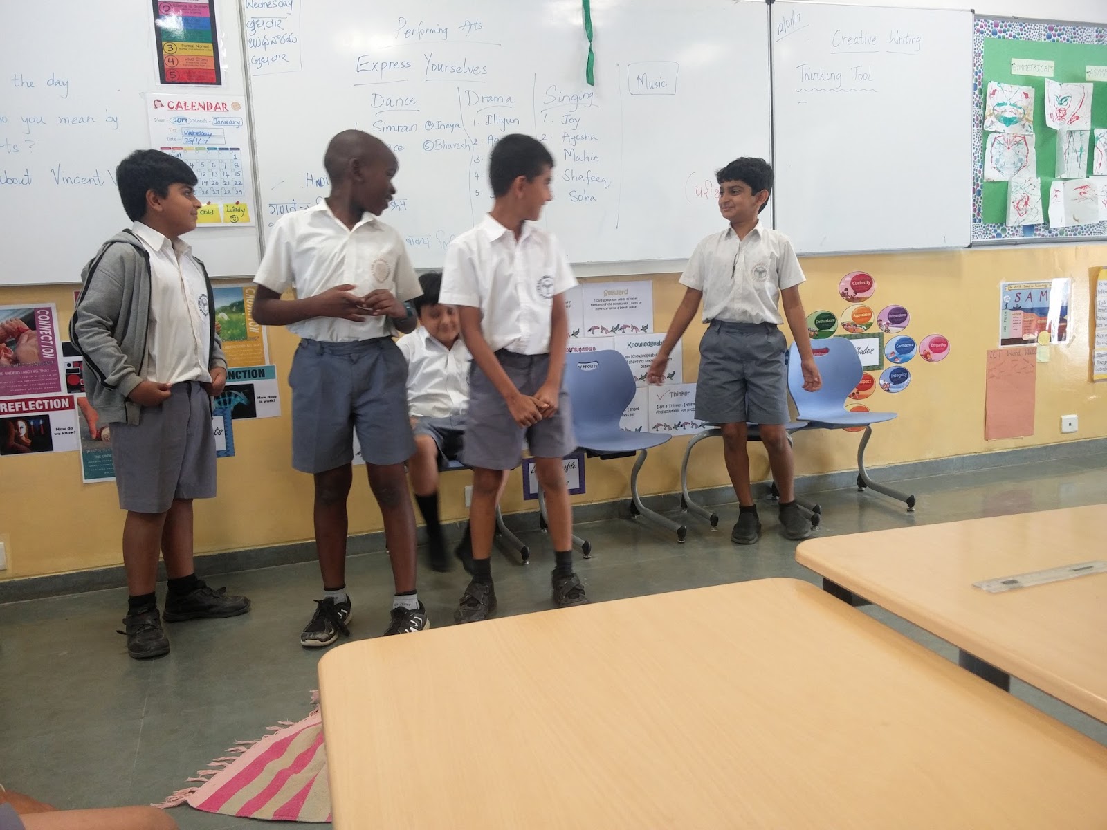 In Maths, students solved addition and subtraction word problems in different groups. In language, students are working on creative writing. They expressed their views and opinions about a piece of music and wrote the climax of the story read called ' The Jar of Sound'. Students are also preparing props for the upcoming 'Literary Fest' so they coloured the two characters from their author study book called 'The Lorax'.
